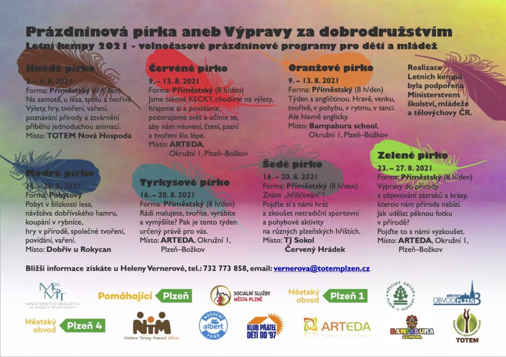 Týdenní programy mají spojovací prvek a tím jsou PÍRKA. Děti si z nabídky vybírají podle svého osobního zájmu a preference oblíbené činnosti (tvoření, pohyb, příroda, atd.). Letos bude důležitou součástí posilování odolnosti, vůle a rozvoj dovednostních schopností. PÍRKA jsou pak ocenění za malé zkoušky a úkoly, která dítě v letních měsících sbírá. Sbírá tak potřebné životní zkušenosti. Program bude uzpůsoben na míru přihlášené skupině – bude zohledňovat věk, schopnosti a aktuální potřeby – přání dětí. Program je vždy veden lektorem, který dané téma dokáže pro děti připravit zajímavě a bezpečně. K dopisu přikládáme konkrétní nabídku jednotlivých týdnů (leták). Další instrukce k jednotlivým týdnům budeme zasílat po přihlášení.